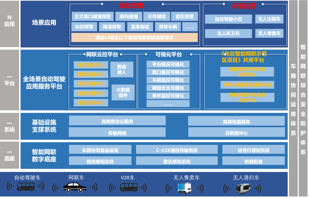 系统总体架构分为:智能网联基础设施数字底座、信息服务支撑、应用平台、场景落地。